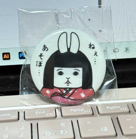 今回はぽみーゆりおさんの漫画やうさものさんのキーホルダー、miyaさんおすすめの斬新なバッジを買いました~。