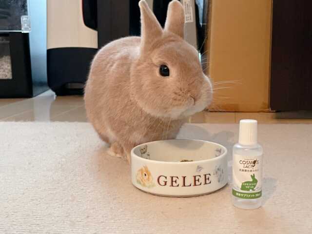 Geléeは普段から水をよく飲むため、お水の受け皿にコスモスラクトラビットを朝夕6滴ずつ垂らして与えてみました。最初は味を確認して考えるような仕草を見せましたが、その後はしっかりと飲んでくれました。ただ数日経つと水を飲む量が減ったため、暑い時期でもありボトルを2本設置して片方にコスモスラクトラビットを垂らしました。この結果、どちらのボトルからも飲むようになり、サプリメントの摂取も安定しています。