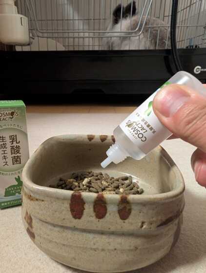 「コスモスラクトラビット」を使い始めた当初は、お水に垂らして与える方法を試していました。しかし、ジュレが飲みたがらない日も出て来て、暑い夏でしたので飲量が減るのは心配です。そこで、ペレットに直接垂らして与える方法に切り替えました。朝夕それぞれ6滴ずつという量で続けてみたところ、ジュレは味にも馴染んでいたようで全く躊躇することなくペレットを完食。この方法に変更してからは、ペレットを残すこと一度もなく安心して与えられるようになりました。