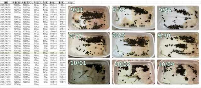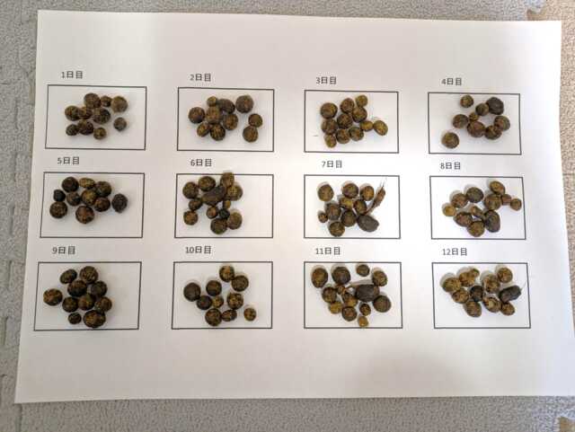 見た目はそれほど変わらず。換毛期もあるので、毛入りのうんちが出てきました。まだ、湿っている黒いうんちも出てるけど、乾いたうんちもちらほら。大きい物で1.0mm以上。小さくても0.7〜0.6mm。換毛期真っ最中ってこともあるかもしれませんが、毛並みがツヤツヤ・ツルツルしてきた気がします。